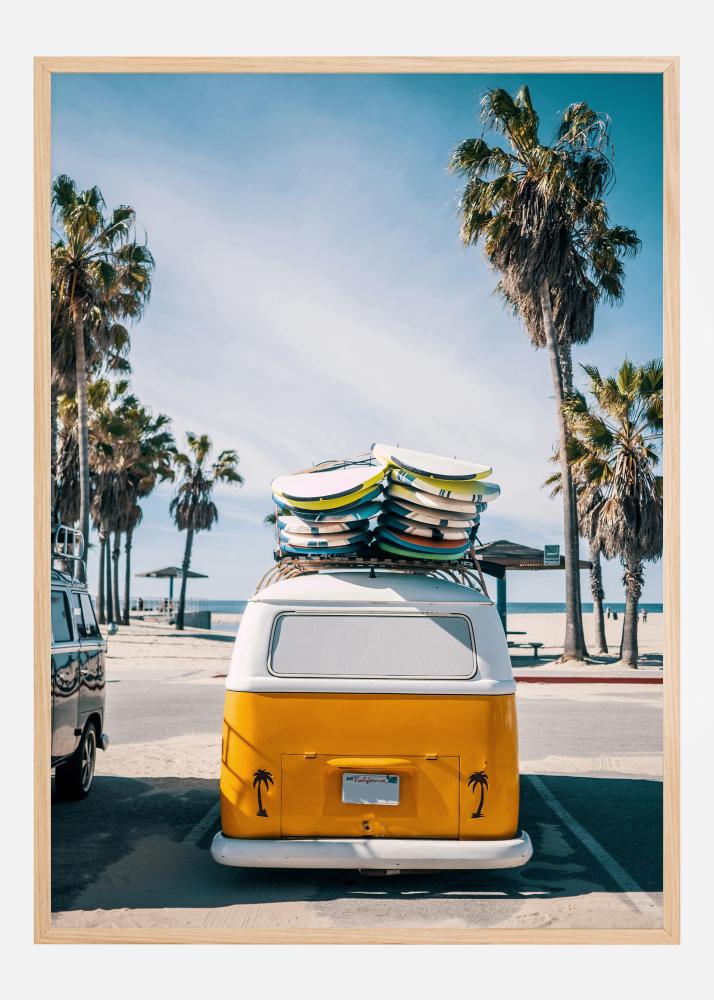 A fun holiday poster of a yellow camper van parked in a carpark near a beach. Palm trees surround the carpark to give this a holiday vibe. Bright sunlight beams down on the scene giving the feeling of a nice hot summer's day, perfect for a quick surf in the sea on one of the car's surfboards.