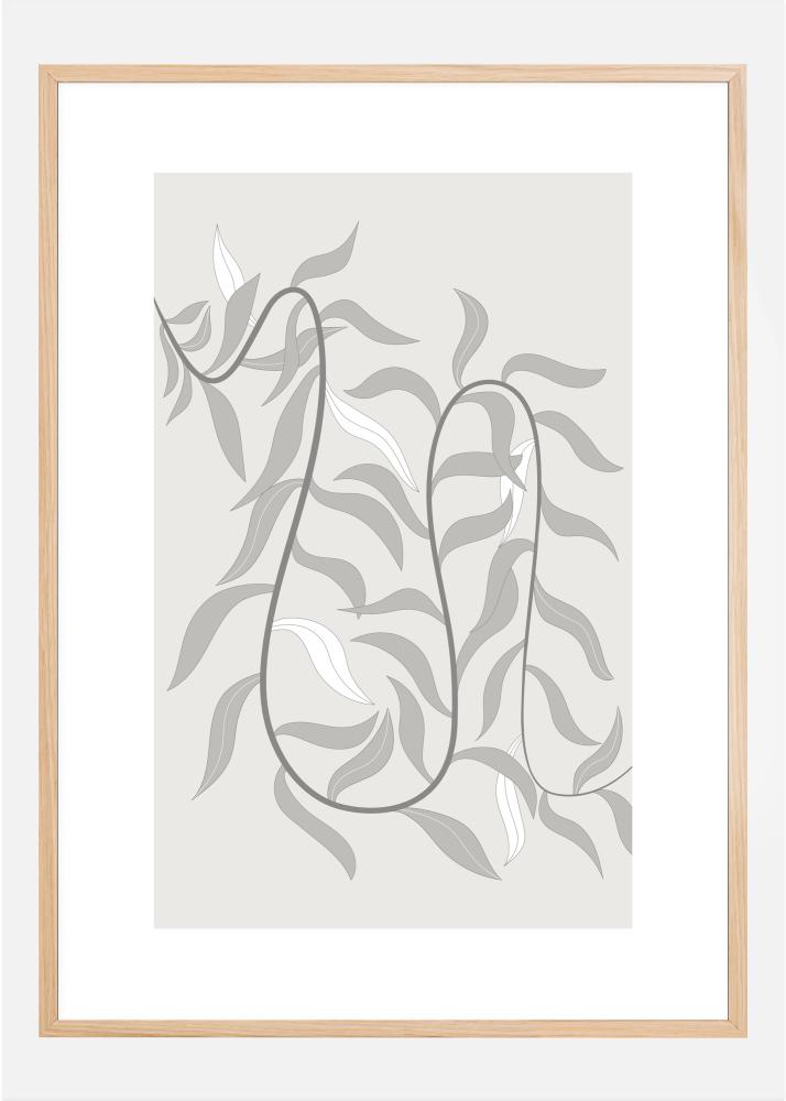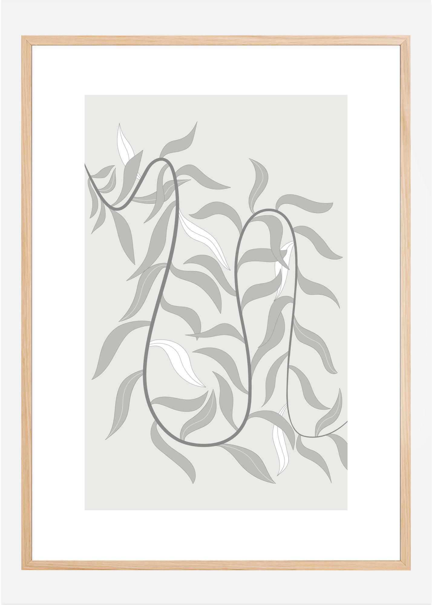 An abstract botanical poster of a creeping vine winding its way across the poster. The design is a simple print style with the leaves in light grey and white. A dark grey vine wends its way between the leaves joining it all together in one sinuous shape. Pair with a soft green wall to get a leafy effect.