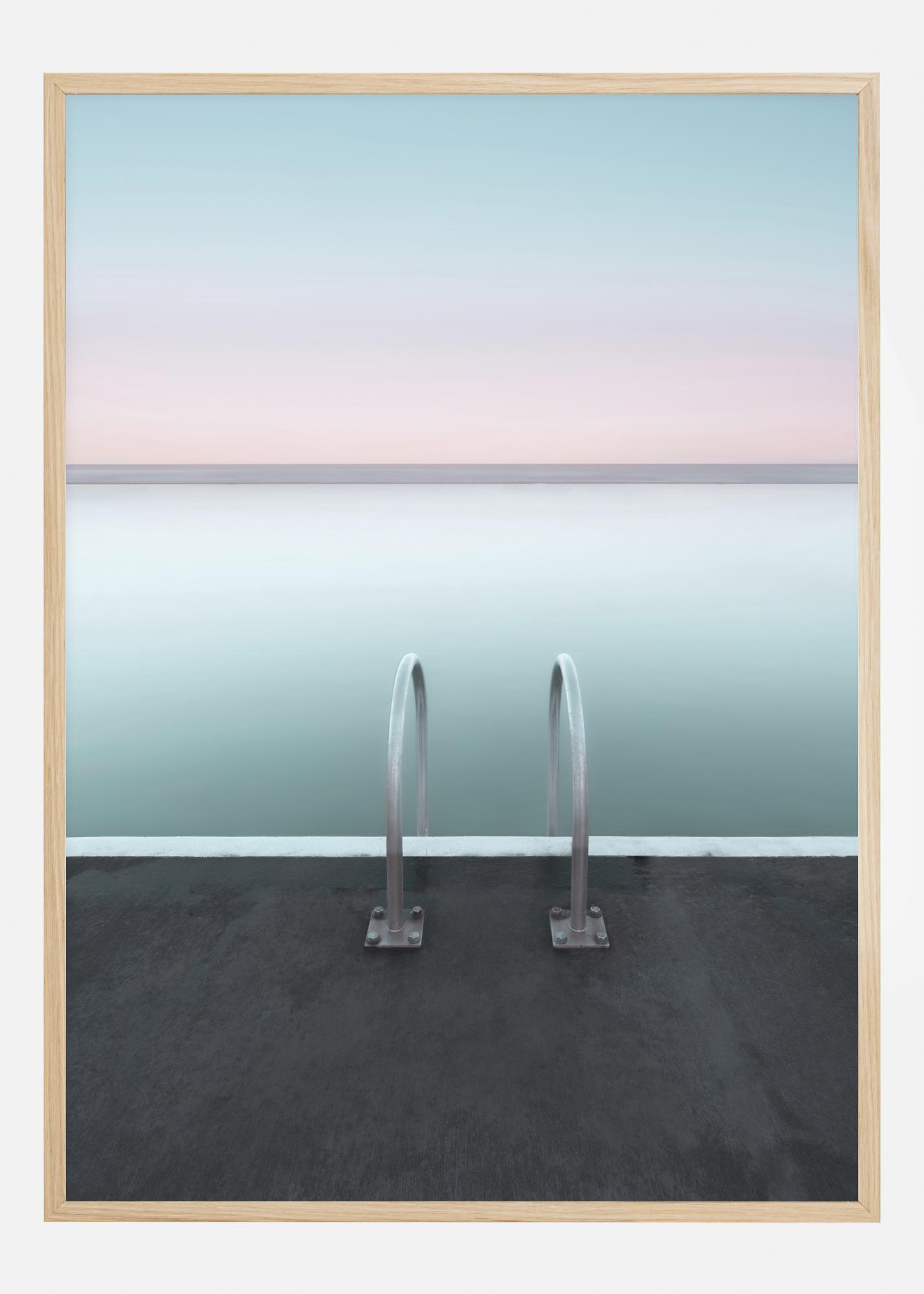 A pastel poster of pool ladder handles leading over the edge of a platform into a vast sea of blue. The handles are enticing, encouraging you to follow them over the edge into the expansive blue water. A soft pale pink sky is seen in the background as the early morning light arrives.