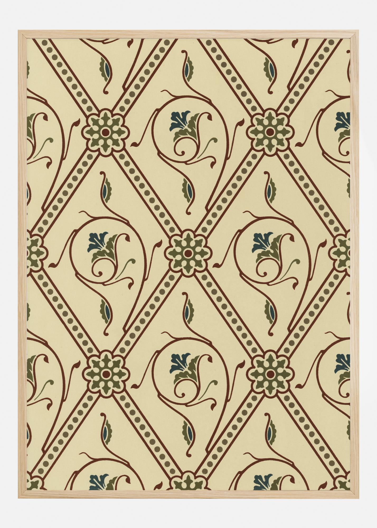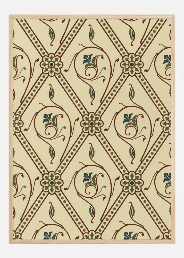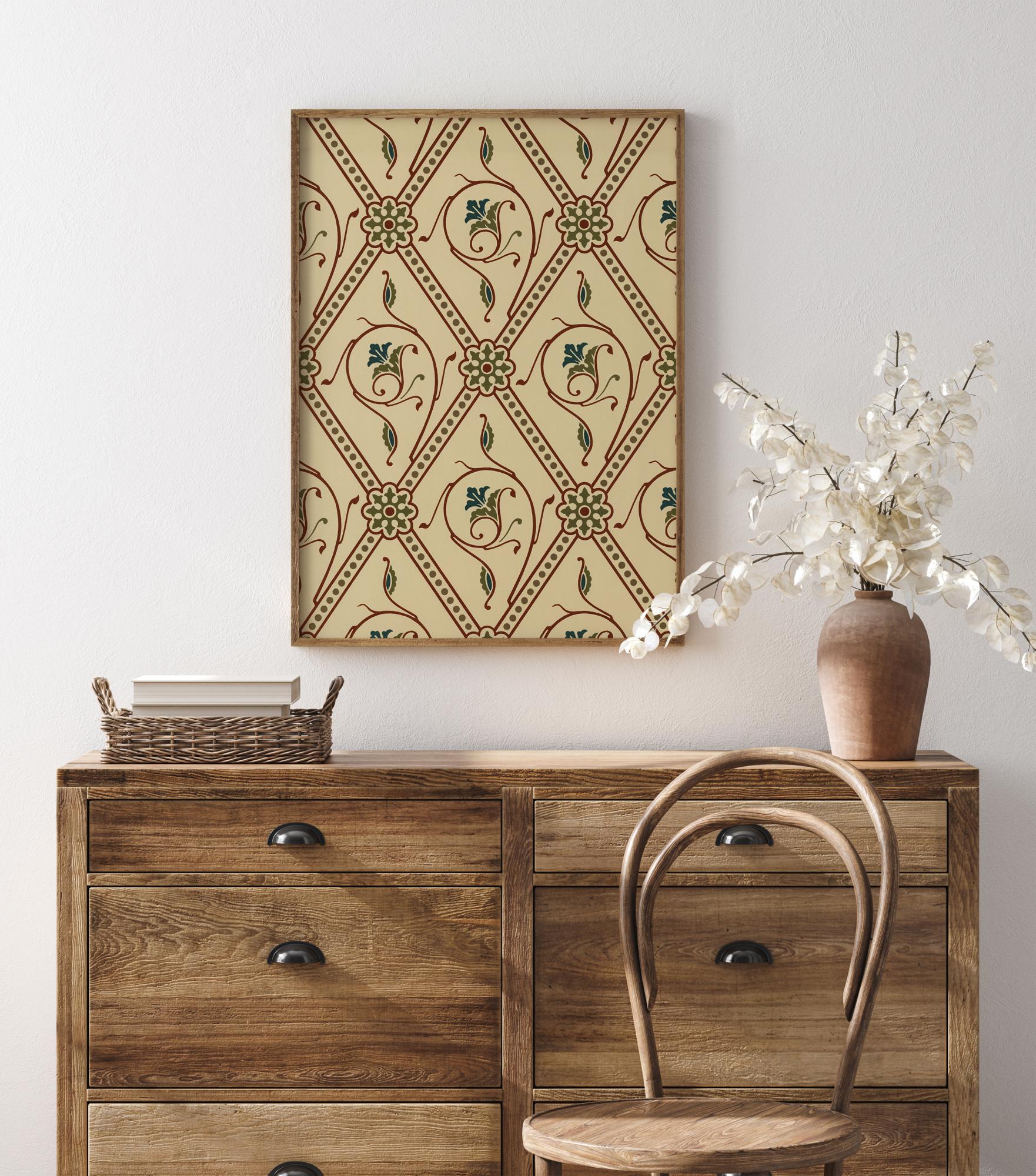 A wallpaper poster with cream, red and green patterns. Large diamonds form the main borders of the pattern. Inside each one is a series of twisting red lines ending in green and blue leaf and flower shapes. The pattern is elegant and flowing, the perfect way to jazz up a plain wall with something a little different.