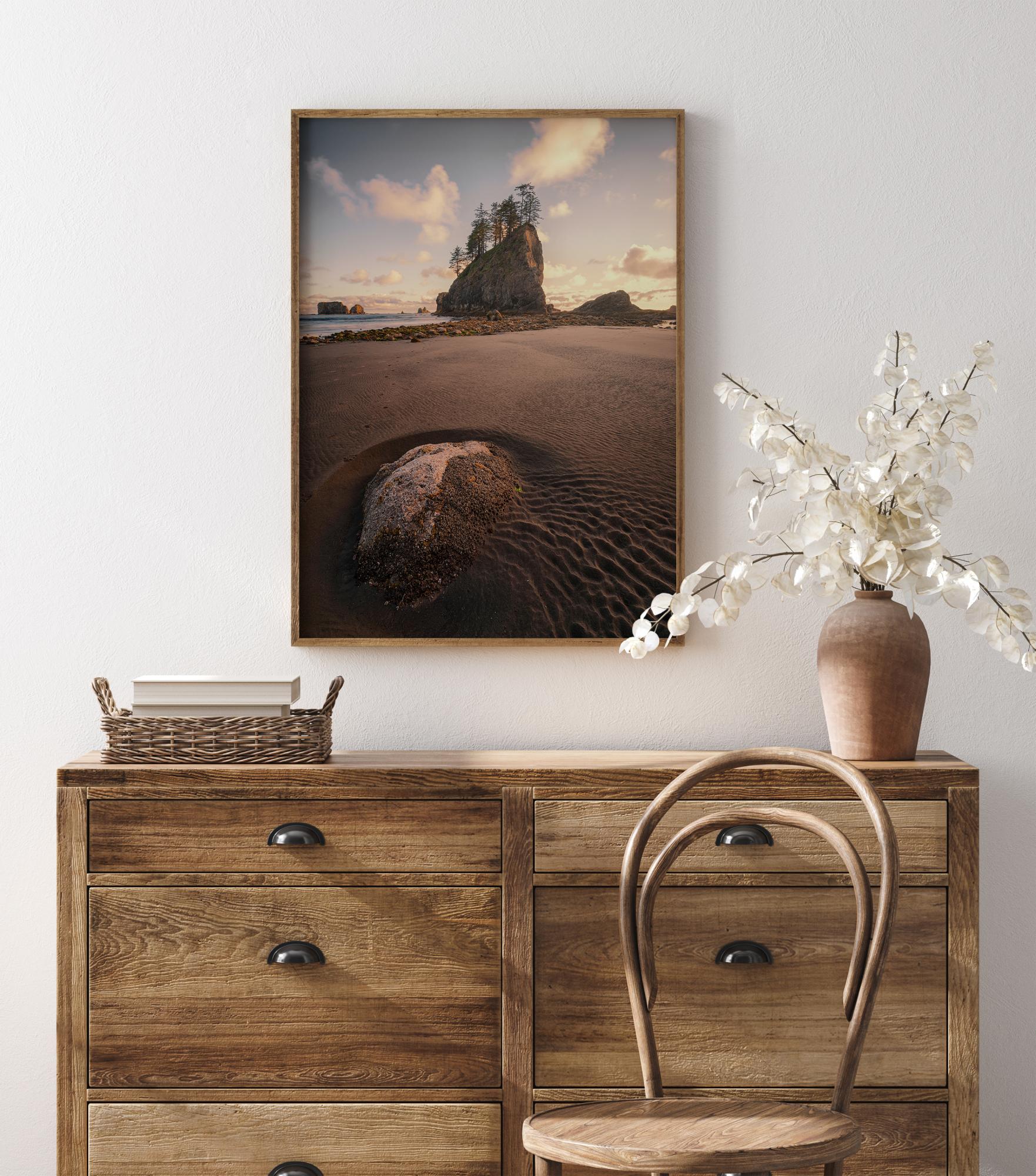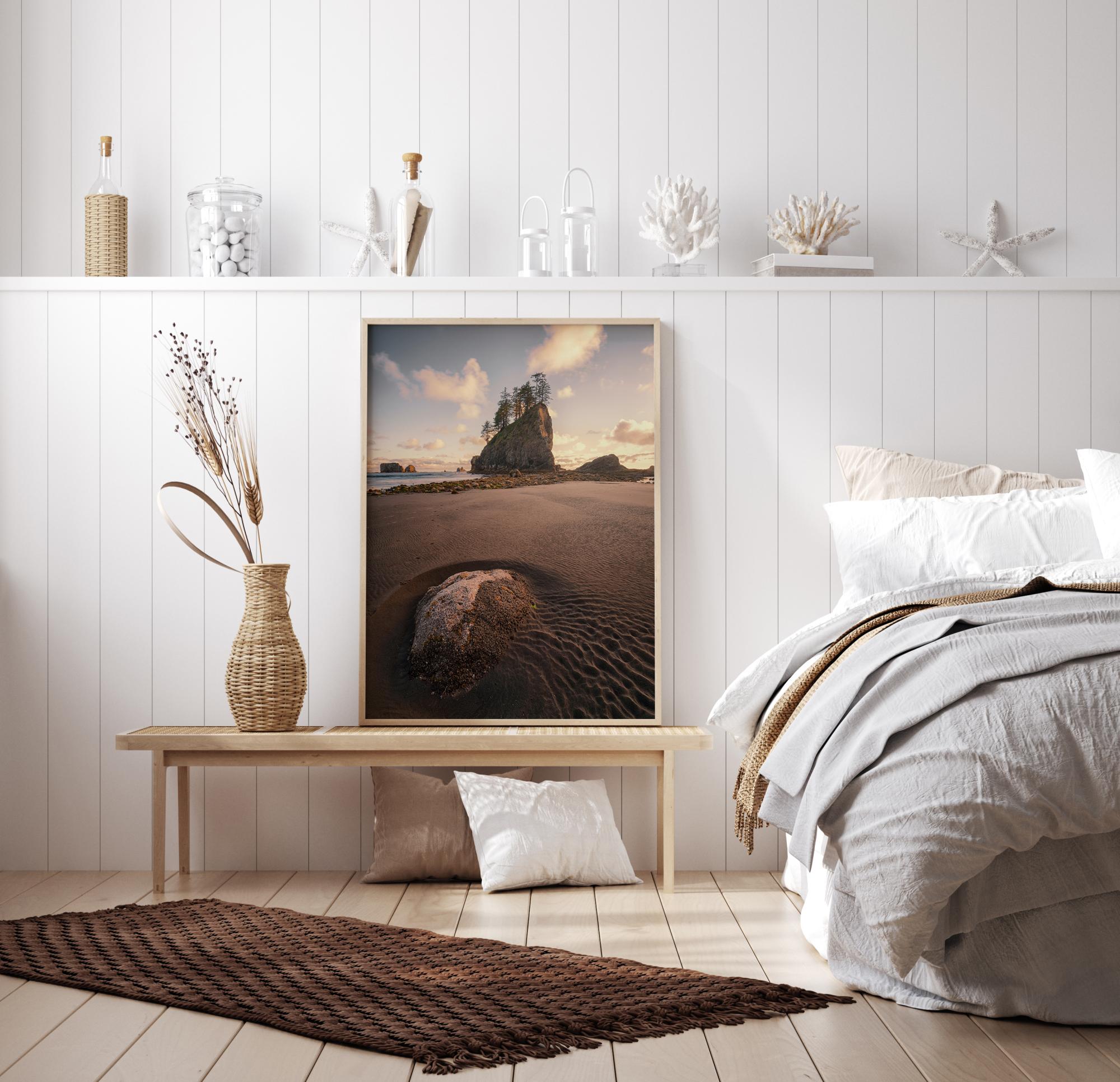 A scenic poster of a close-up of the beach. The low angle gets you close with the sand where you can follow the water trails that have been created from a rock pool. In the distance, a tree-covered rock rises out of the sea against a soft blue sky filled with fluffy white clouds.