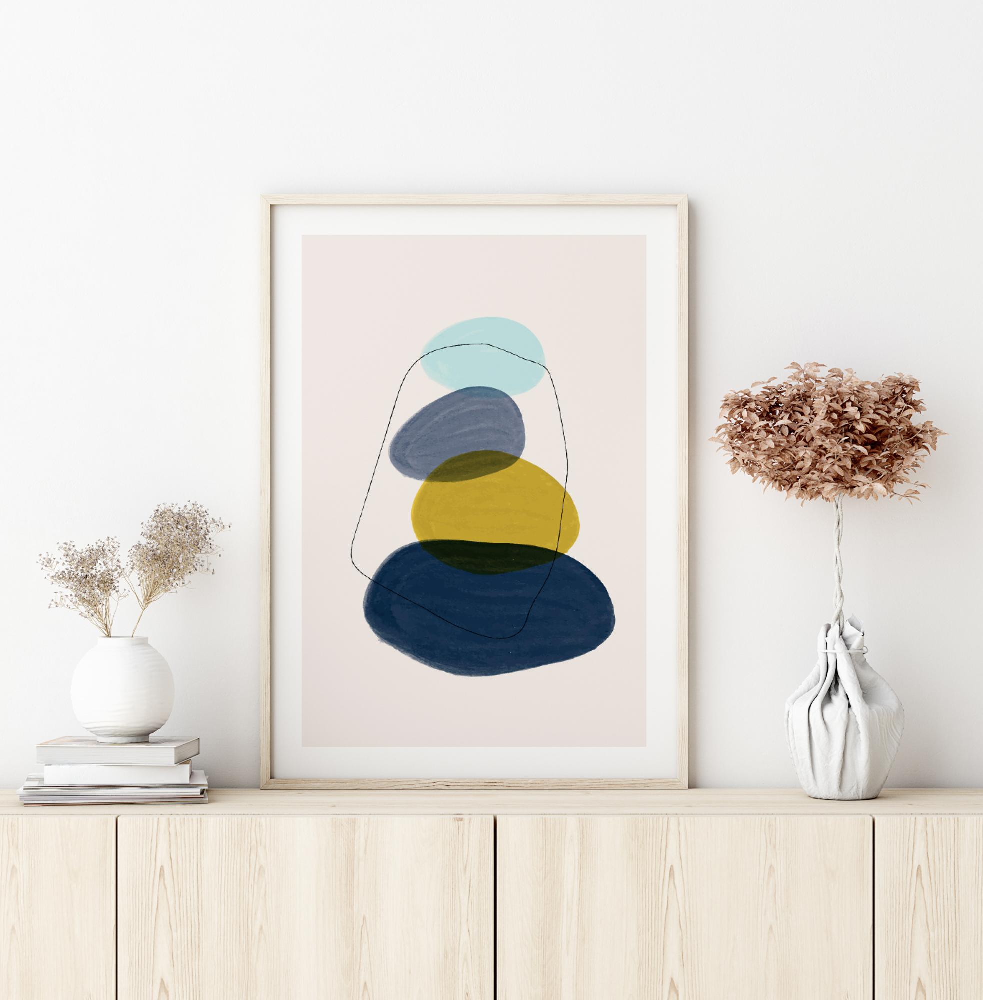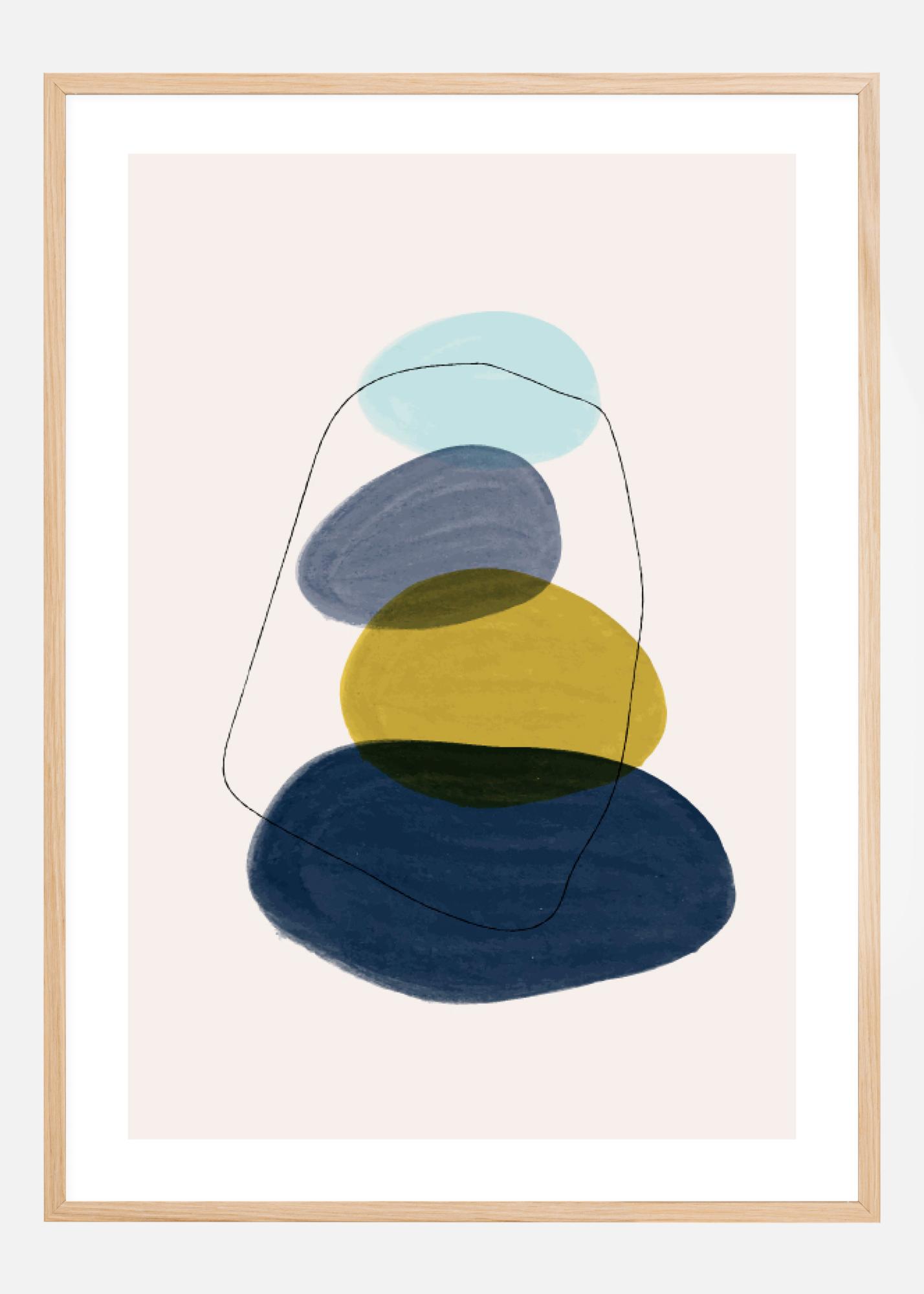 A fun abstract poster of different round shapes that look like stones. The shapes start off big and gradually get smaller as they pile on top of each other in this fun image. The dark blues, light blues and yellows of this image makes this a bright, uplifting piece for your home.