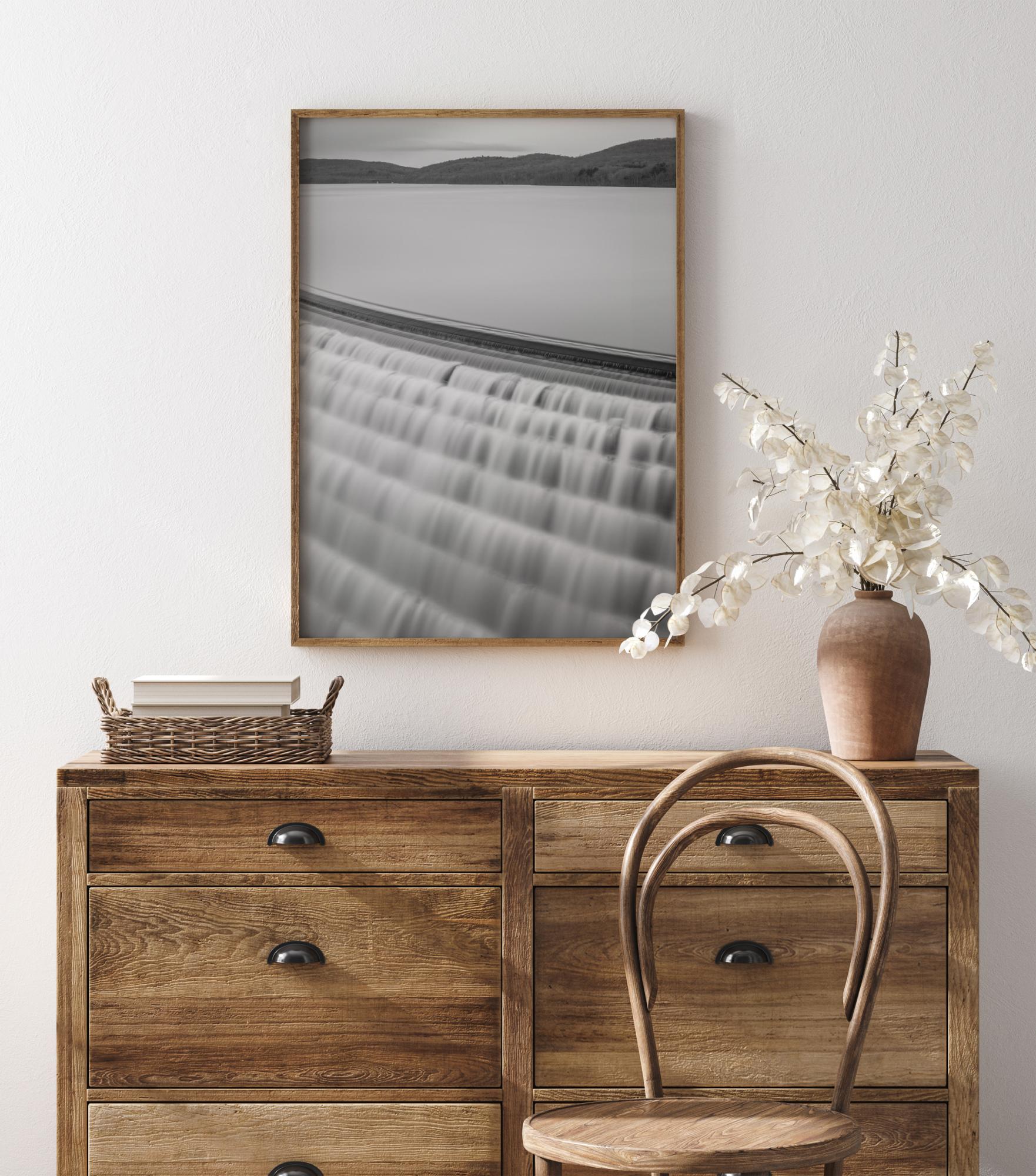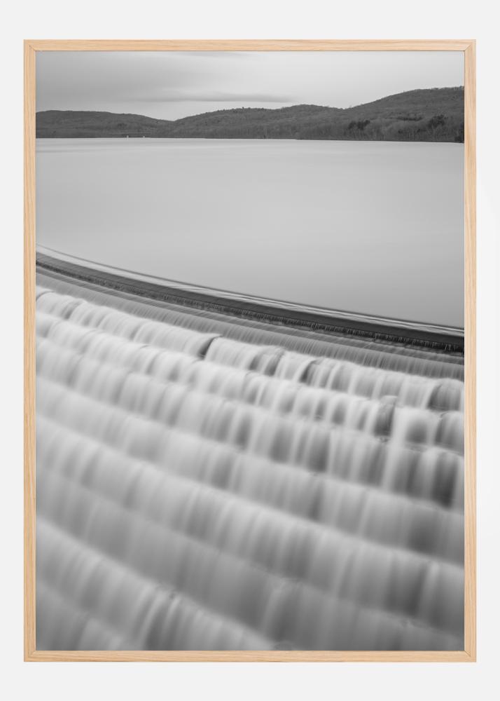 A grey poster of mini waterfalls cascading over a man-made dam by a lake. The still grey waters stretch out with the tiny waterfalls streaming over the little ledges to create a fast-moving pattern. Relax and let your eyes follow the streams of water as they flow down.