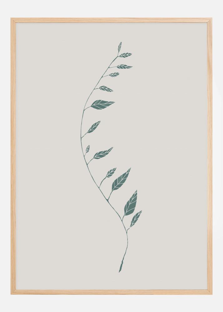 A minimalist poster of a long green branch that curves gently on a white background. The thin line of the branch waves gently, all the leaves are on the same side as if there is a wind blowing them. Its simplicity endues a calm feeling, great for a relaxing bathroom vibe.