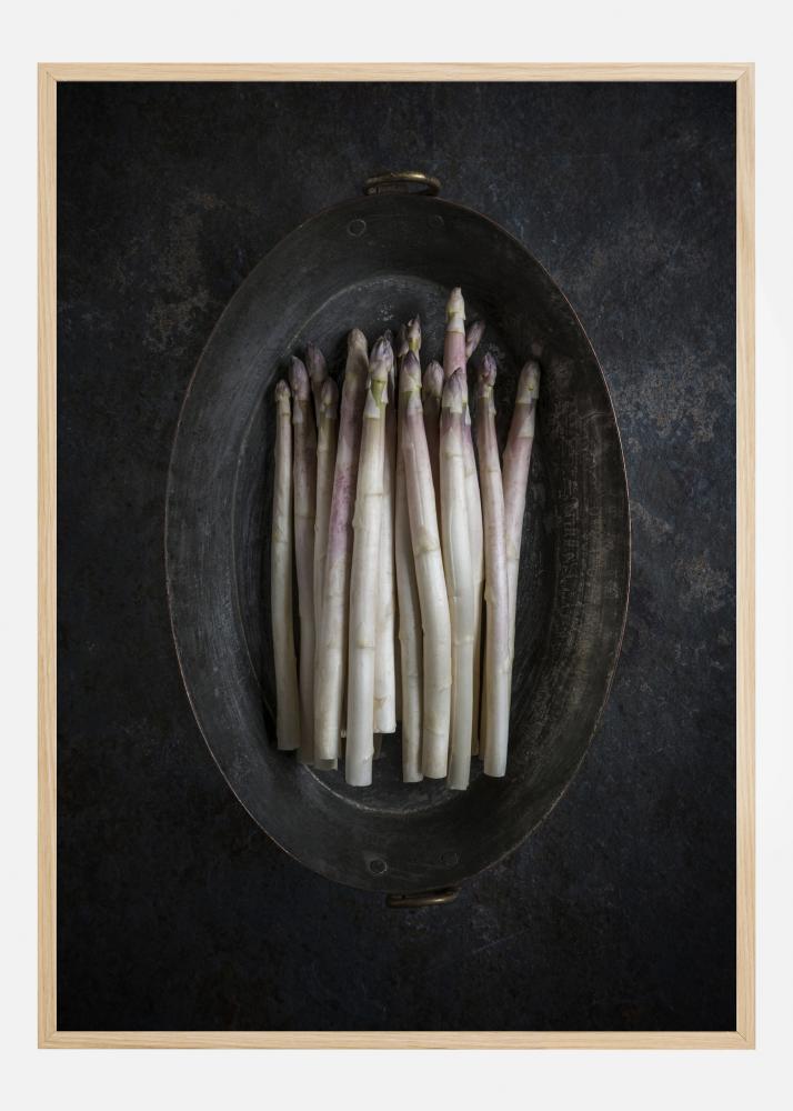 A vegetable-themed poster with white asparagus sitting in a pan. The white asparagus stalks stand out in strong contrast against the dark black pan and tabletop. Add this fun image to your kitchen to get inspired when you cook.