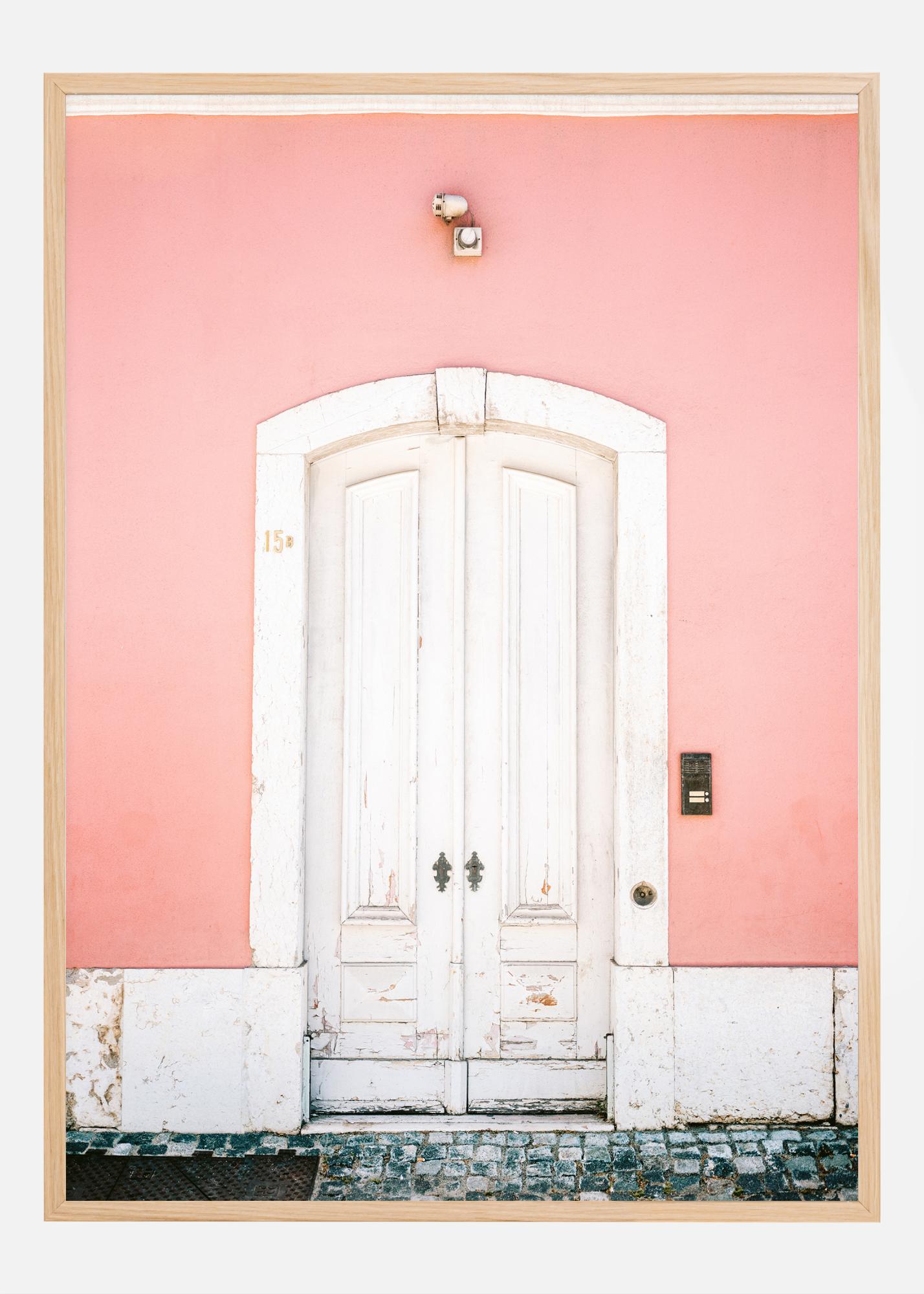 This poster presents a beautiful image of a white door against a softly pink wall, a view that exudes the relaxed yet elegant style so typical of Lisbon. The white-painted surface of the door, showing signs of patina and age, gives a sense of history and character, while the black iron details add a classic touch. The house number "15" is discreetly placed to the left of the door, and the cobblestone pavement enhances the charm of the European cityscape.