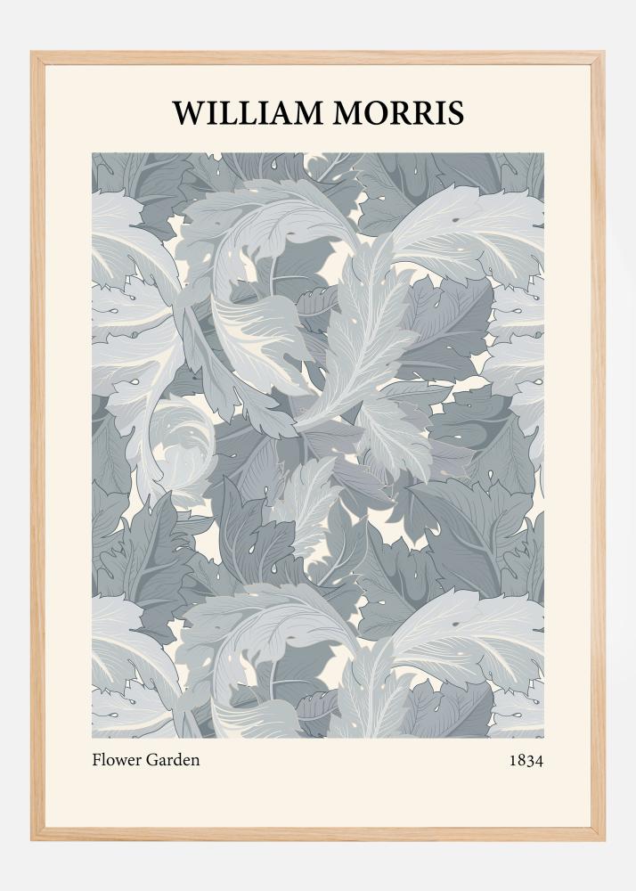 This poster with its lush and sophisticated William Morris motif offers a sense of both tranquility and classical elegance. The design is an ode to the abundant greenery often associated with Morris and his work within the Arts and Crafts movement. The motif, called "Flower Garden," contains a condensed composition of foliage and blossoms, presented in cool tones of blue and gray with touches of cream white. Every detail in this poster is carefully thought out, creating a sense of a virtuous and orderly garden.
