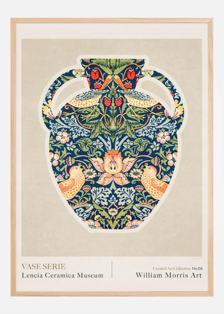Poster number 06 in our "Curated Art Collection" at the Lencia Ceramica Museum is a rich tribute to William Morris' craftsmanship. It depicts a vase adorned with a symmetrical and detailed pattern, vibrant with motifs of birds and flowers iconic of Morris' design philosophy. Each element in this pattern is thoughtfully designed to celebrate the beauty of nature and art's ability to imitate it.