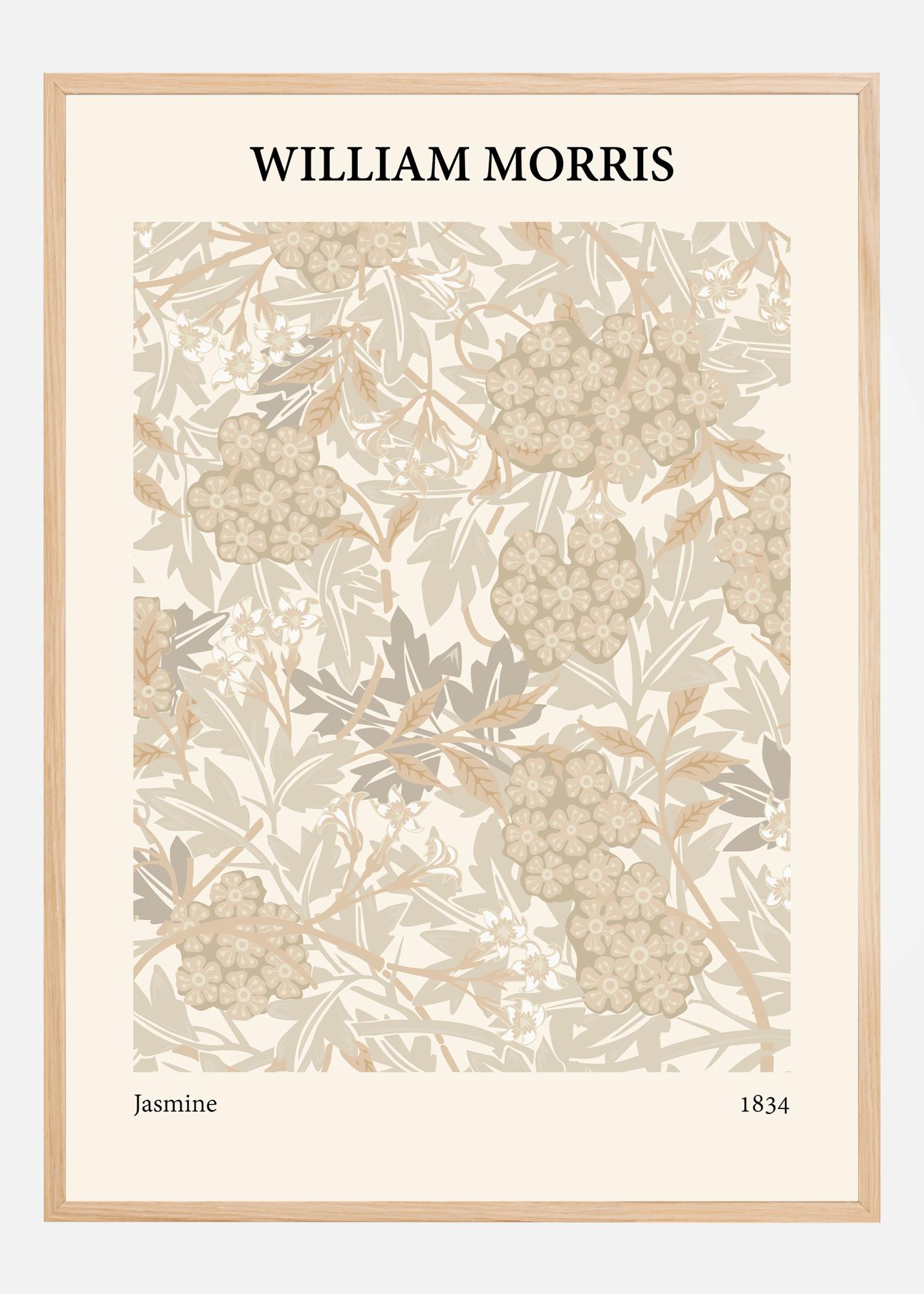 This beautiful poster by William Morris, titled "Jasmine," is a tribute to the classic English garden, full of fragrant flowers and lush greenery. The pattern is densely woven with blooming jasmine and other flowers, surrounded by leaves in various shapes and sizes. The color palette is soft and earthy, with a mix of neutral beige and brown tones against a warm cream-colored background, creating a sense of calm and harmony in the home.