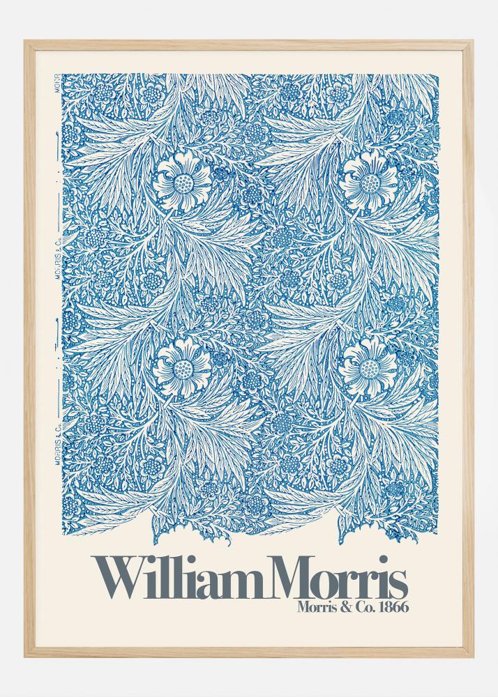 This poster features a classic William Morris pattern named "Marigold," created by Morris & Co. around 1866. The iconic pattern, known for its intricate and nature-inspired elements, is crafted in a deep blue color against a clean, cream-colored background. Every detail in the floral arrangement is meticulously carved out, showcasing Morris's sense of beauty in the natural and an ability to transform it into artworks that are timeless and beloved even today.