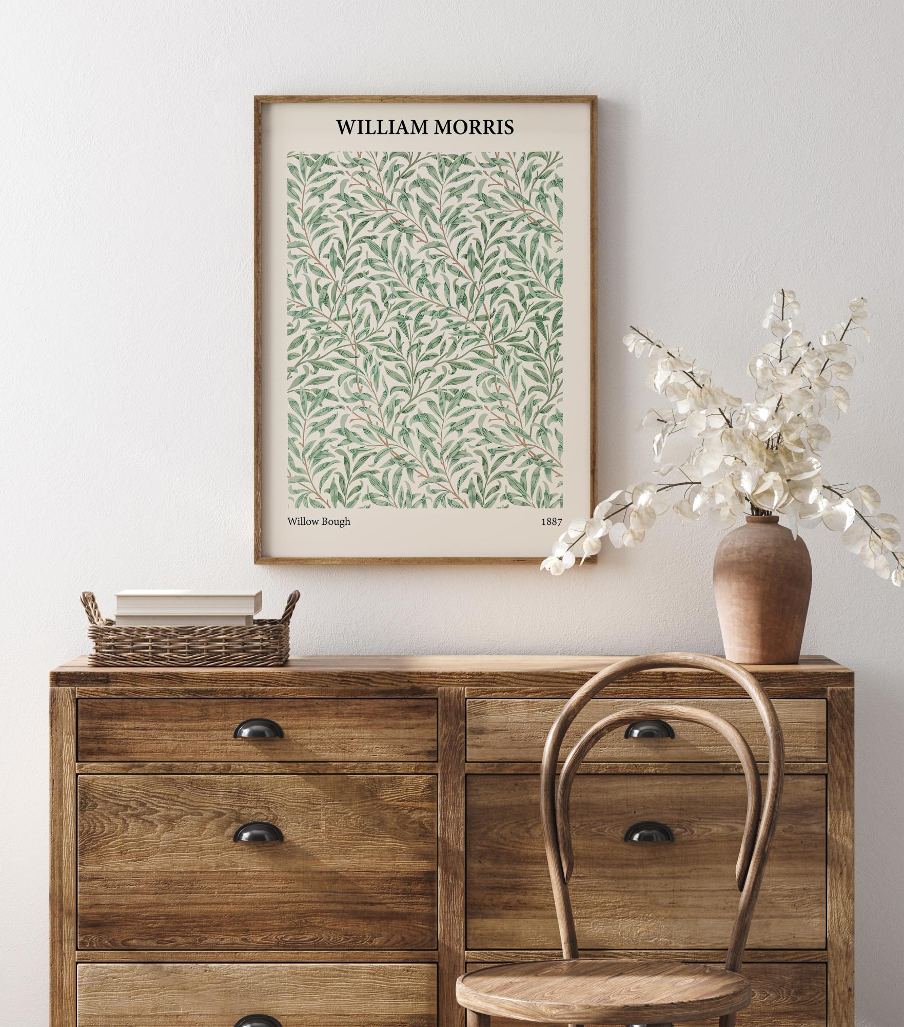 A patterned poster of a William Morris willow bough print. The simple green leaves fill the print, each joined by thin branches to create an intricate pattern throughout the image. Add this to a pastel wall for something a little bit different.