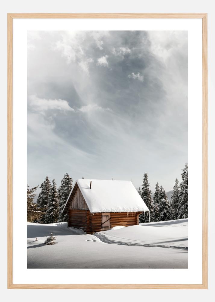 A Christmas poster of a little wooden hut in a snowy landscape. Soft snow coats the ground and the cabin roof in this wintery image. Fir trees are covered in snow and dark grey snow clouds fill the sky ready to bring more snow. Feel the winter chill in this elegant print.