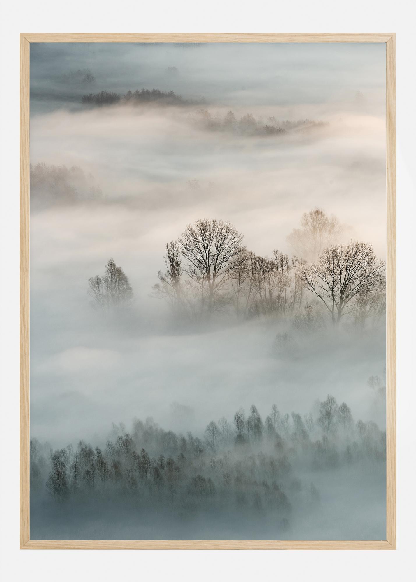 A magical print of a misty landscape with a forest. Mist covers most of the land with trees popping up here and there like little islands in the fog. A soft pink light permeates the mist creating a warmer feel in this almost fantasy land.