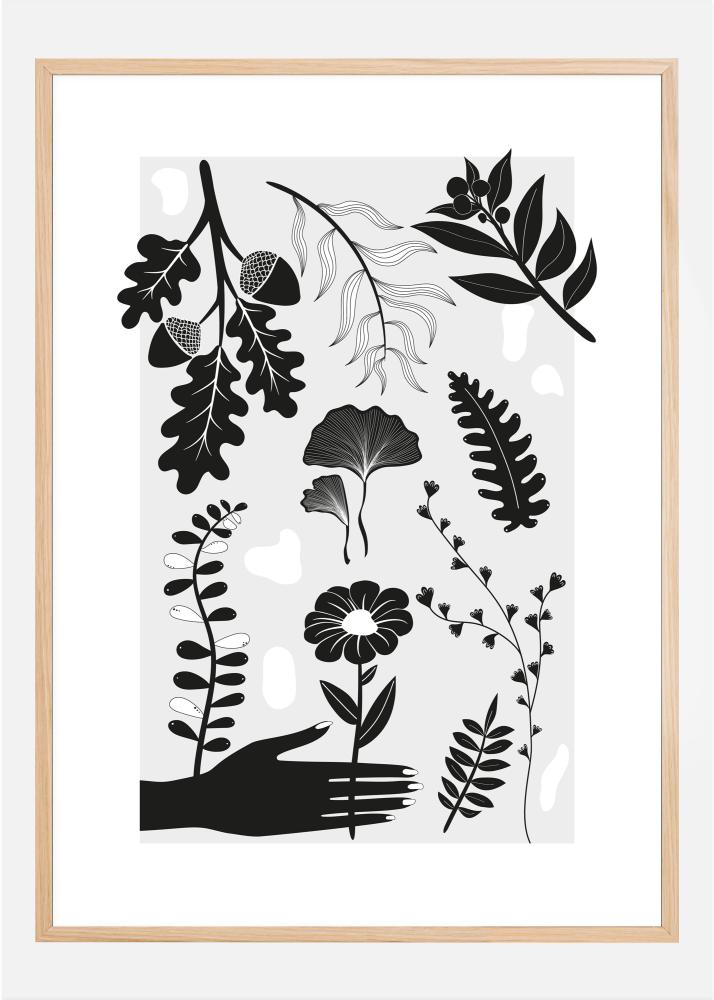 A bold poster with black and white print designs of different leaves, plants and flowers. A black hand reaches out to grab one of the stylised flowers. Acorns, flowers, ferns and more fill this simple yet interesting print. Get yourself into a botany mood when you add this plant poster to your home.