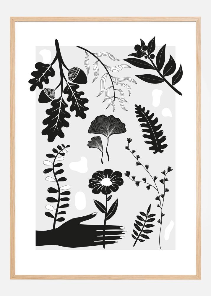 A bold poster with black and white print designs of different leaves, plants and flowers. A black hand reaches out to grab one of the stylised flowers. Acorns, flowers, ferns and more fill this simple yet interesting print. Get yourself into a botany mood when you add this plant poster to your home.