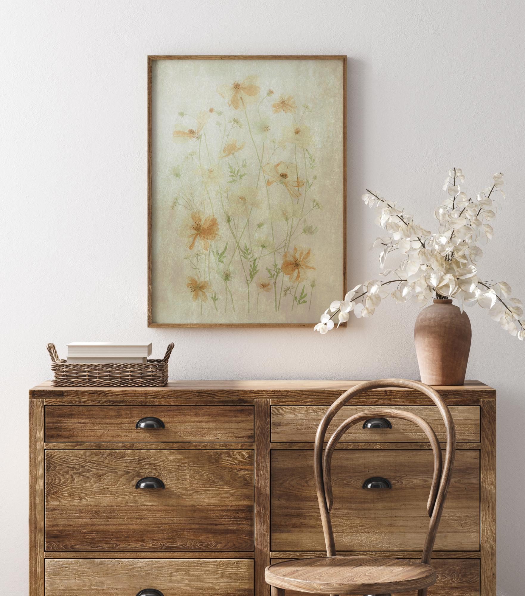 An elegant poster of soft orange flowers and green leaves on a white background. The watercolour effect makes each of these plants look soft and delicate. Yet there are great details in each for this soft, floral print. Make your home a garden of Eden when you bring this Cosmos flower print home.