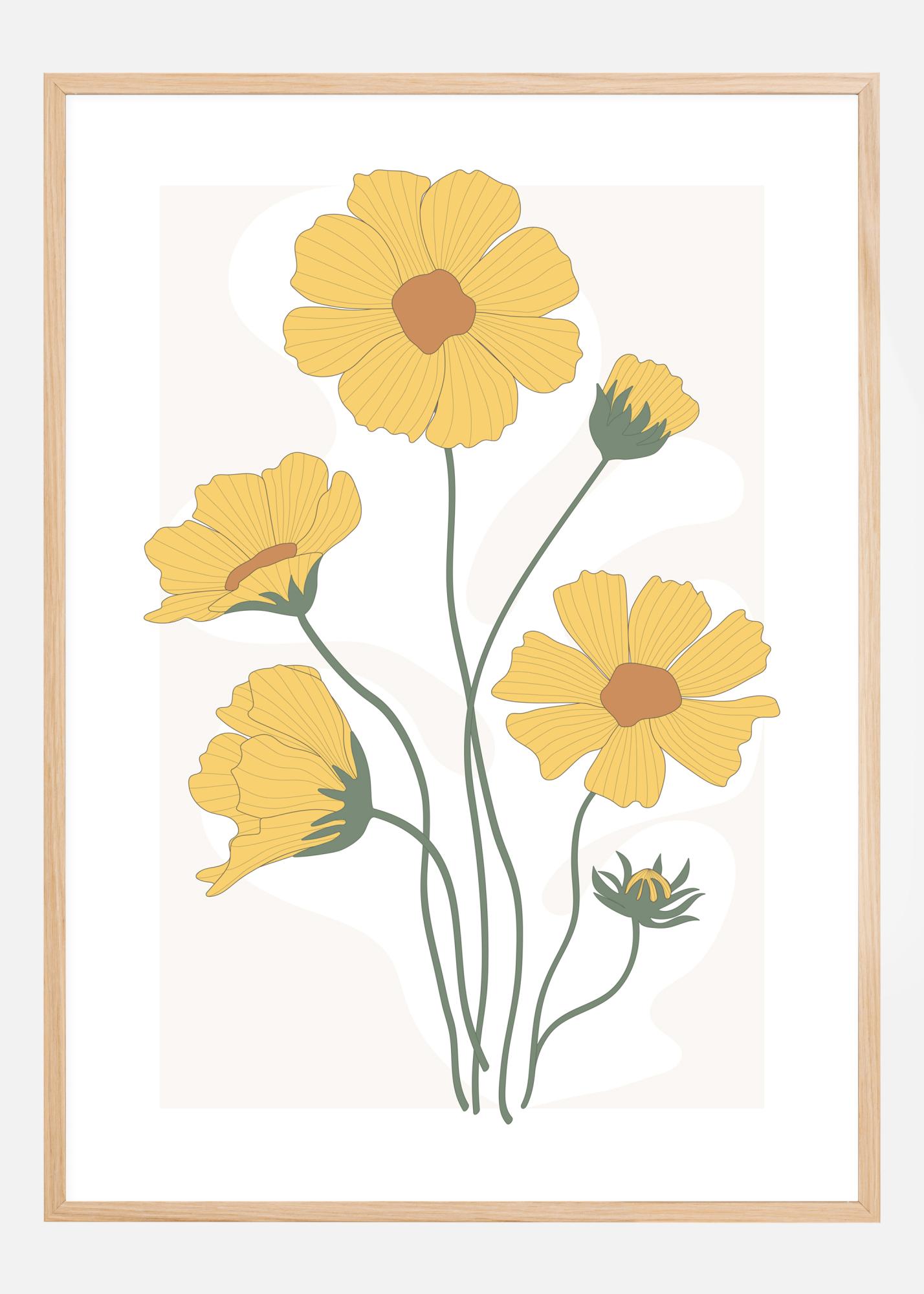 A bright poster of yellow marigolds created in a fun print style. Each of the flowers glows against the white background. Despite being a simple stylised design, the flowers are cheerful and the perfect way to wake up with a smile on your face.