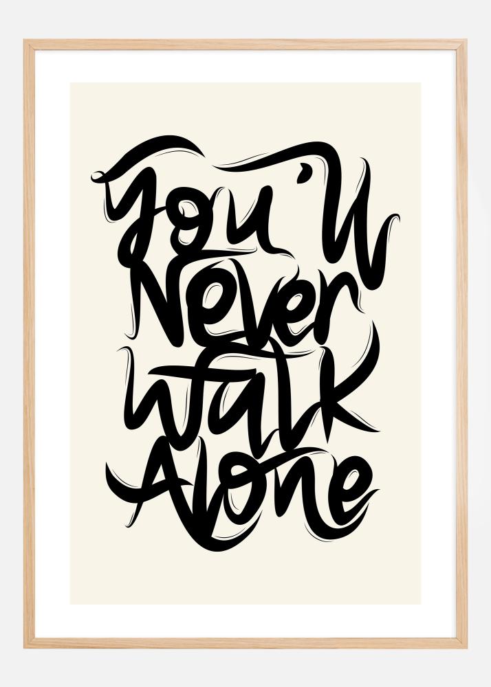 This powerful poster features a playful and artistic calligraphy of the phrase "You Never Walk Alone" in blackened text against a warm, cream-colored background. The flowing and dynamic style of typography shows the words intertwined, giving an expression of movement and unity. The design skillfully balances between readability and artistic freedom, making the text both a message carrier and an aesthetic object in itself.