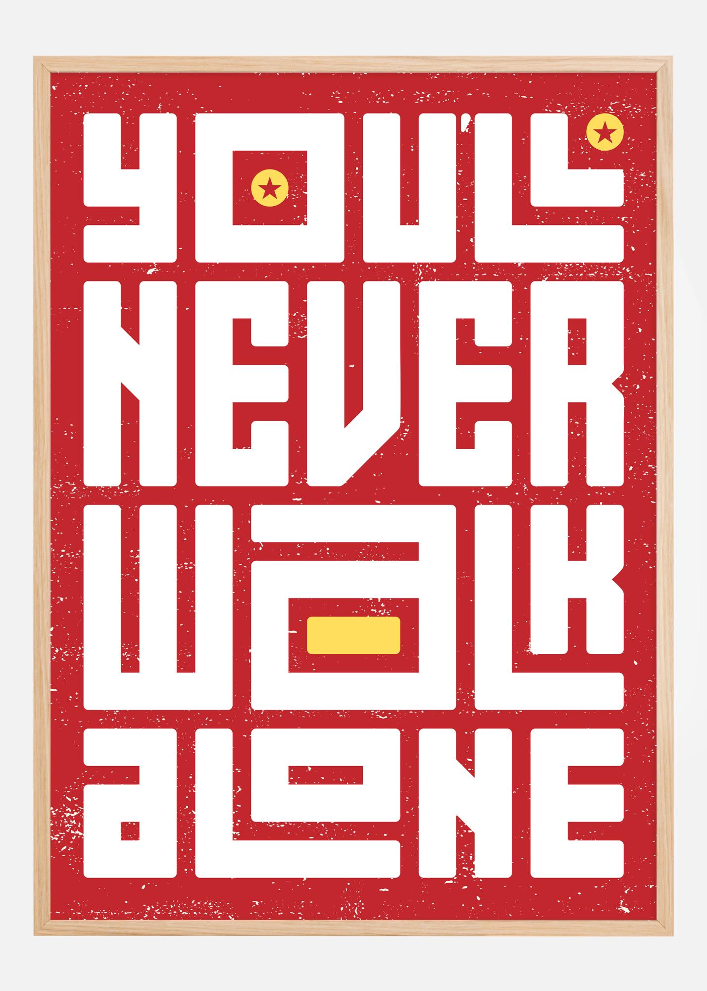 This energetic and uplifting poster exudes a strong presence with its bold, blocky typography that highlights the message "You'll Never Walk Alone" in brilliant white letters against a powerful red background. The large letters are carefully arranged to maximize their visual impact and are embellished with gold-colored stars and a rectangular shape that breaks up the text block, adding an additional dimension to the design.