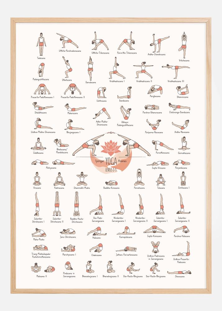 In the center of the poster, the title 'Iyengar YOGA Asanas' is highlighted surrounded by a stylized lotus flower, the symbol of purity and spiritual awakening in yoga. This poster combines practical information with an aesthetically pleasing layout, making it a perfect complement to any yoga studio, home practice, or as part of a health-inspired interior design. The soft colors allow the poster to be both a focal point and a harmonious part of the room's overall design.