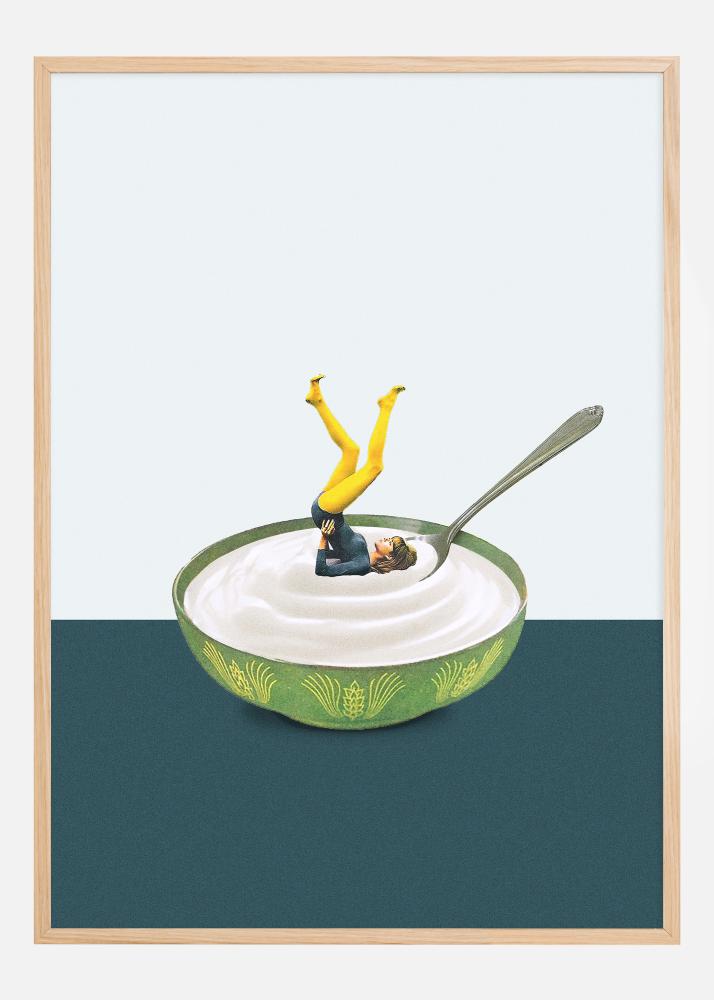 This unique and playful poster presents a humorous image of a person performing a yoga pose submerged in a bowl of yogurt, complete with a pair of playfully yellow pants that match the inverted position. The creative image combines elements of surrealism and everyday humor and is a refreshing departure from traditional art and decoration. The two-tone background helps highlight the unusual composition and makes it a conversation starter.