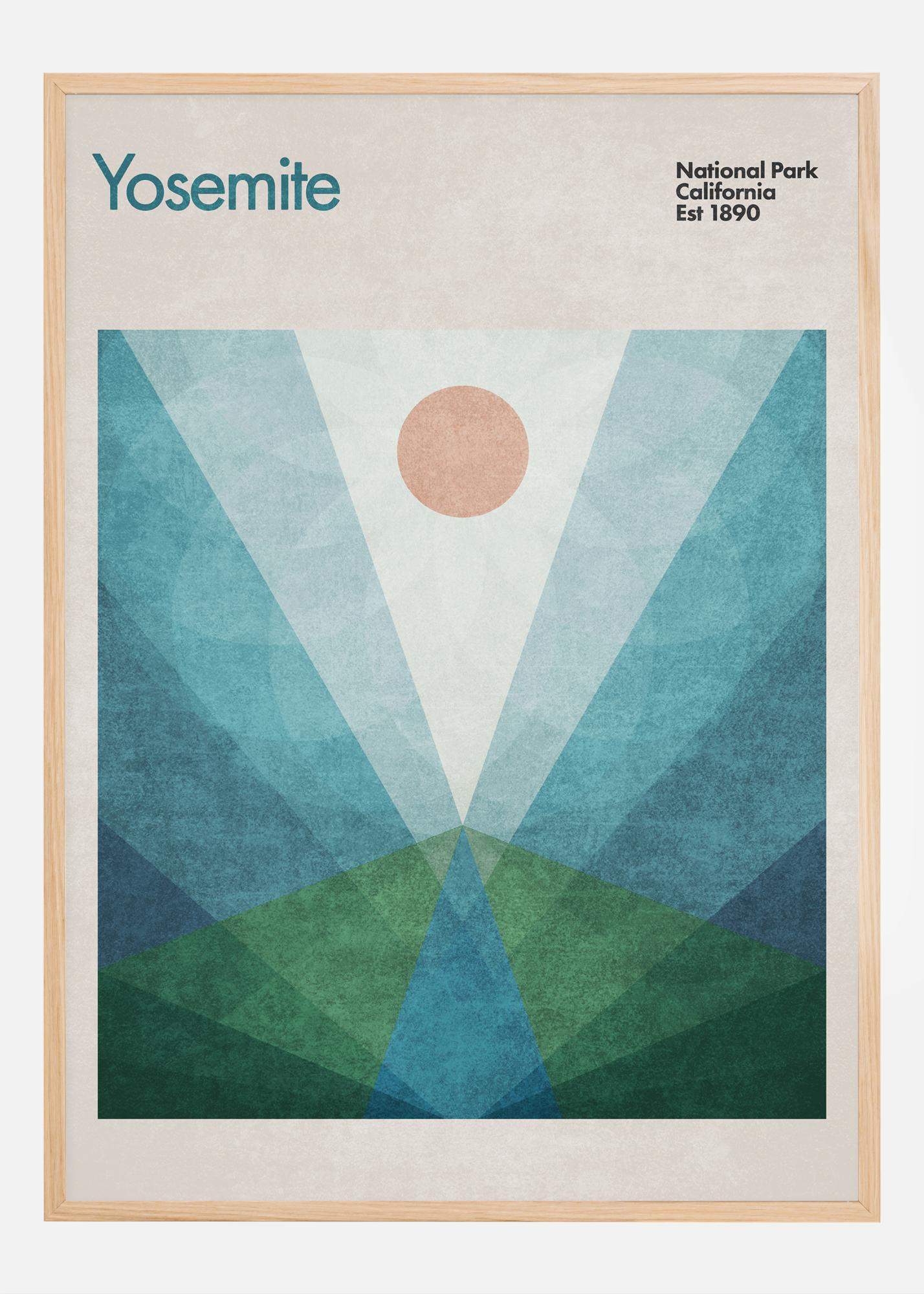 This poster captures the spirit of Yosemite National Park with a geometric design reflecting the majestic and iconic landscapes of the park. With a color palette reminiscent of clear skies and lush valleys, the text "Yosemite National Park California Est 1890" celebrates the park's long history as a national park and a natural treasure.