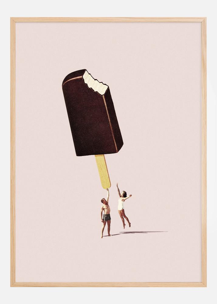 This charming poster offers a unique and playful image of two people who seem to have discovered a gigantic ice cream stick! With its imaginative composition and warm pastel pink background, this picture conveys a sense of summer joy and nostalgia. The happy figures, dressed in simple swimwear, reach for the ice cream stick, which has a realistic appearance with a bite taken out of it, creating a delightful contrast against the minimalist setting. This creative and lively scene captures the viewer's attention and evokes memories of sunny days.