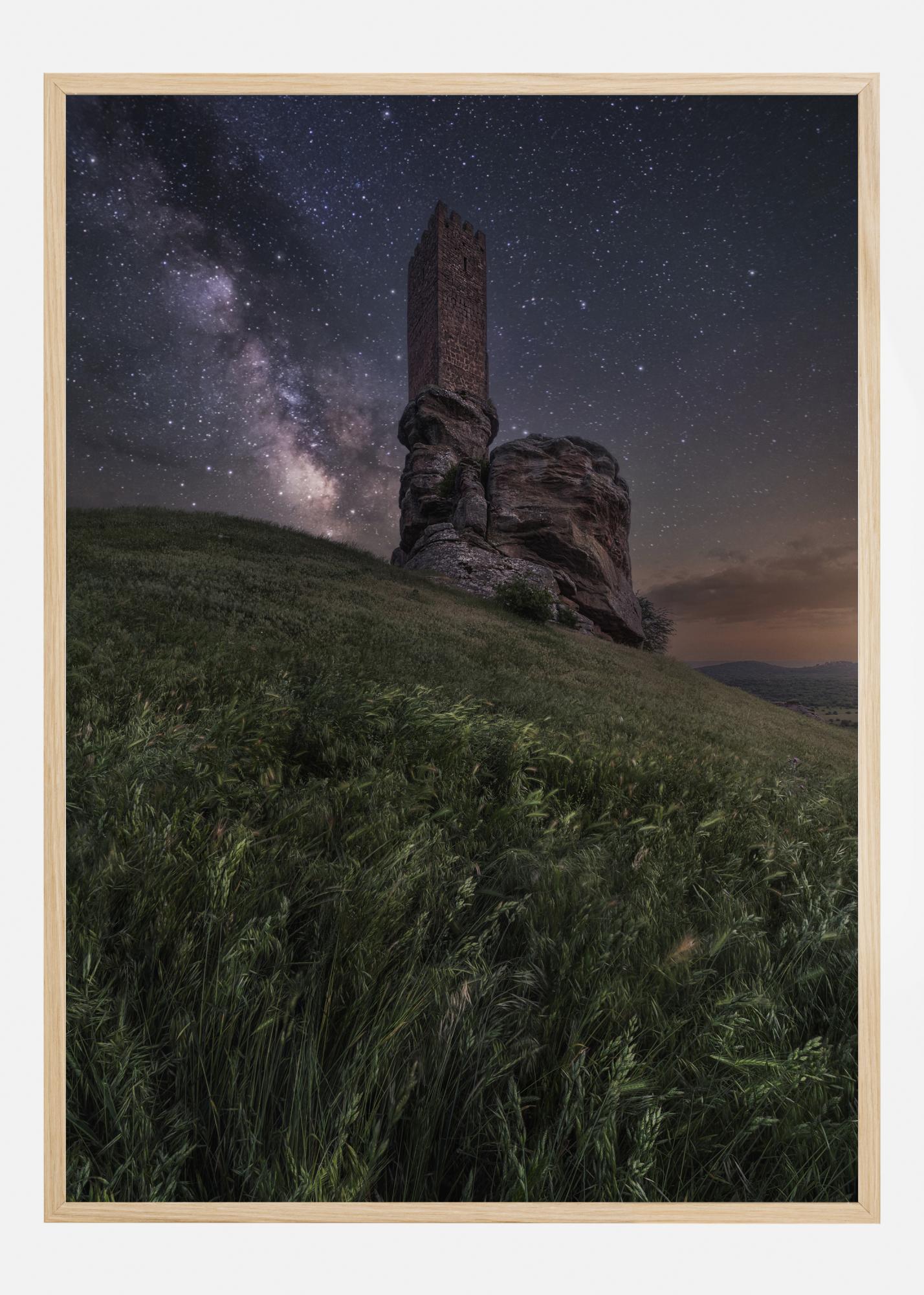 A magnificent poster of Zafra Castle at night. Look up to this old stone structure from the bottom of a grassy hill. The turret reaches up to the night sky where the Milky Way arches across the sky. This beautiful shot will look great on any wall in your home and add a touch of the magical too.