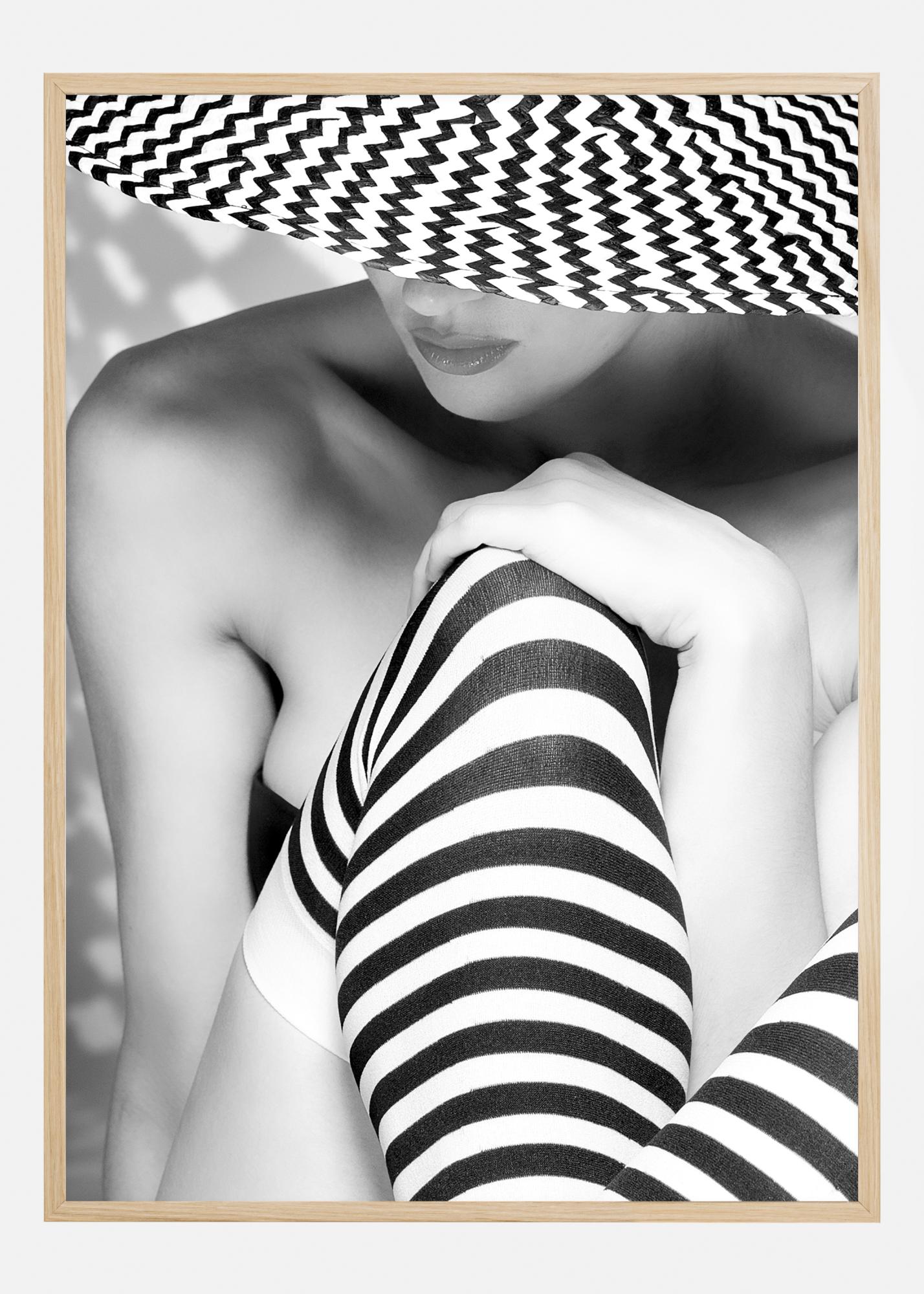 A geometric portrait poster of a woman wearing a patterned hat and stripy stockings. She leans forward, one hand on her knee. Her face is obscured by the pattern of the hat in this eye-popping image. Pair this with a touch of colour on your wall and watch those patterns explode.