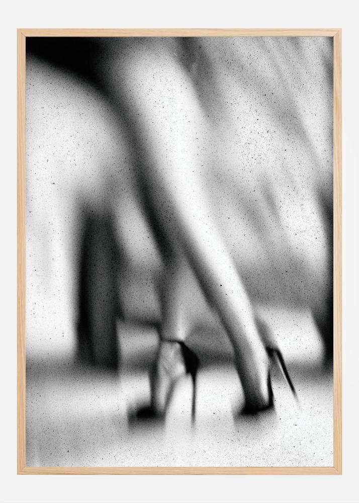 This artistic poster plays with blur and contrast to create a sense of movement and abstraction. It depicts a pair of legs in high-heeled shoes in an atmospheric and almost motion blur, giving the piece an ethereal and dynamic feel. The poster's monochrome color scheme evokes a sense of both timelessness and modernity.