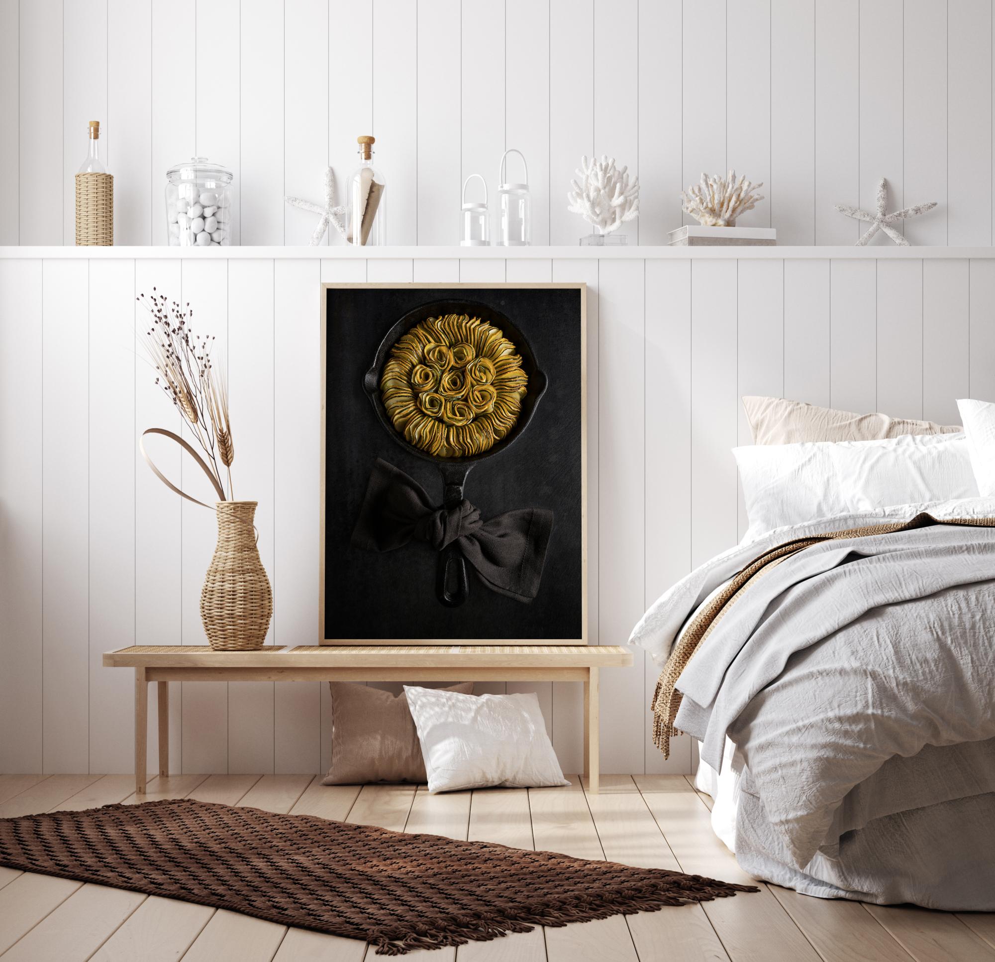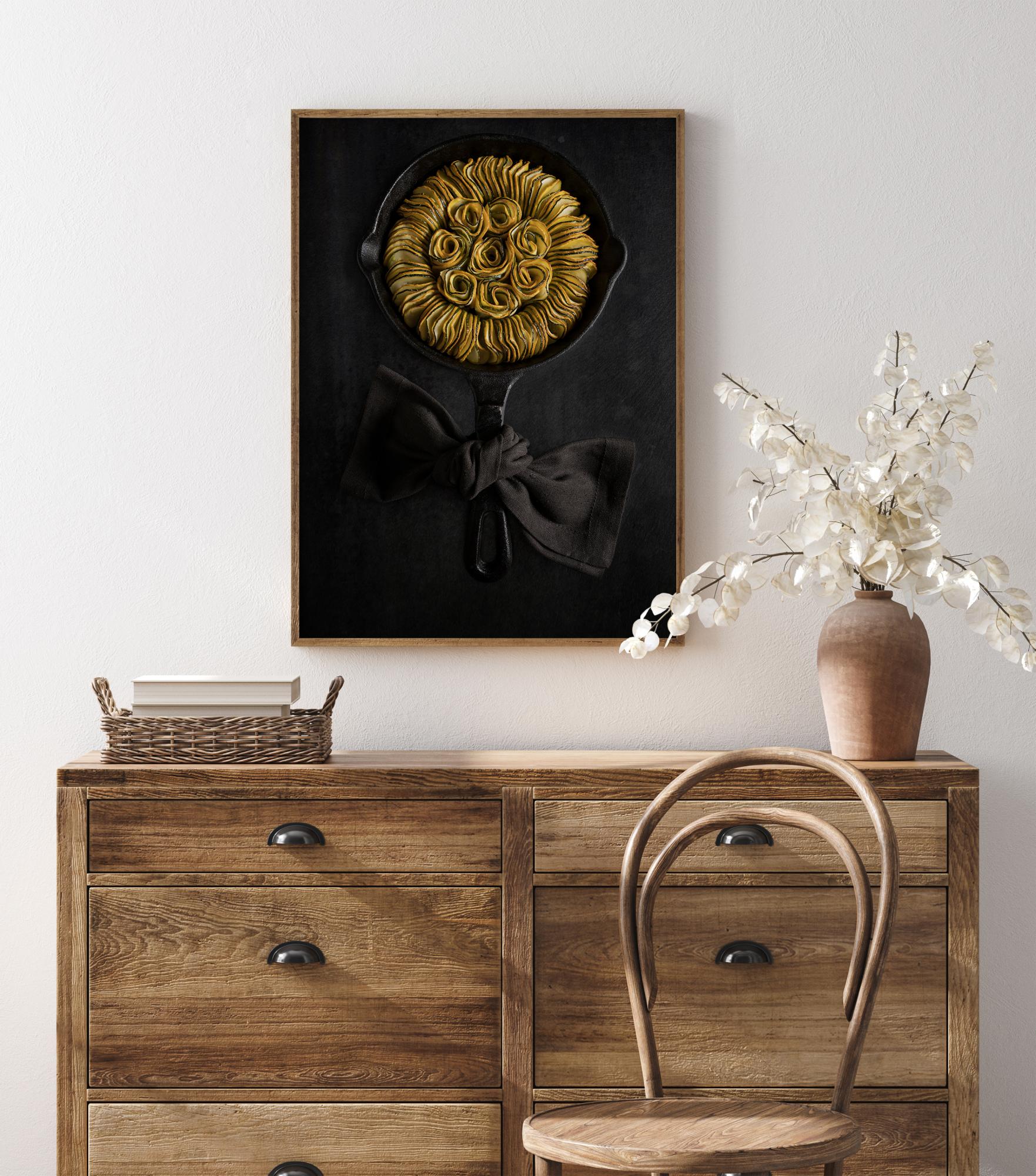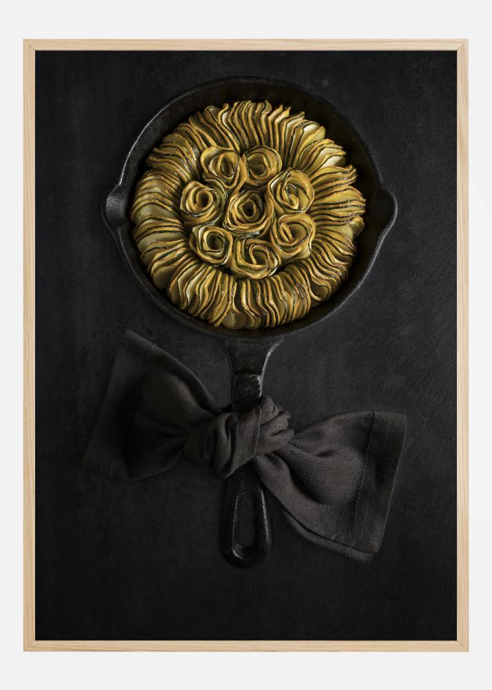 A delicious poster of courgette ratatouille with the courgette or zucchini wrapped elegantly in a pan creating a stunning sunflower shape. The yellow and green courgettes stand out against the black frying pan, a cloth bow tied about its handle. Hang this in your kitchen and see if you can make this enticing dish.
